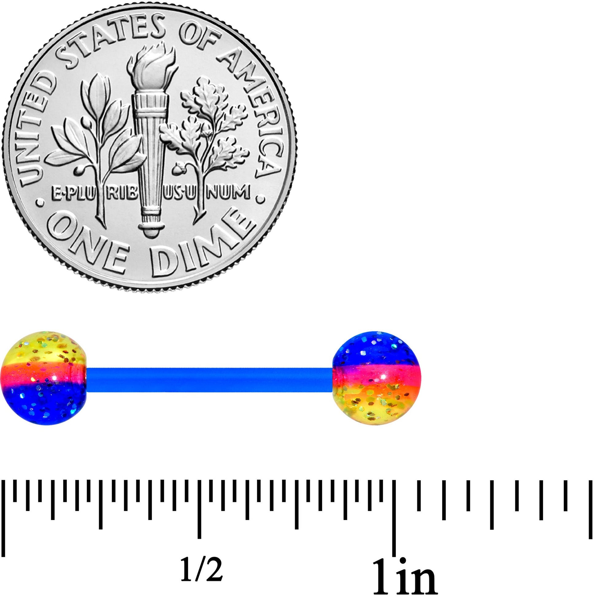 Give your every word some extra impact with this 14 gauge tongue ring! It's made with a blue 5/8" flexible acrylic straight barbell for an extra-comfortable fit. It features 5mm semi-transparent orange, blue, and yellow striped acrylic ball ends with glitter set inside. And if that weren't eye-catching enough, the ball ends glow under UV light! Let your tongue piercing brighten up the night with this UV reactive tongue jewelry!Specifications