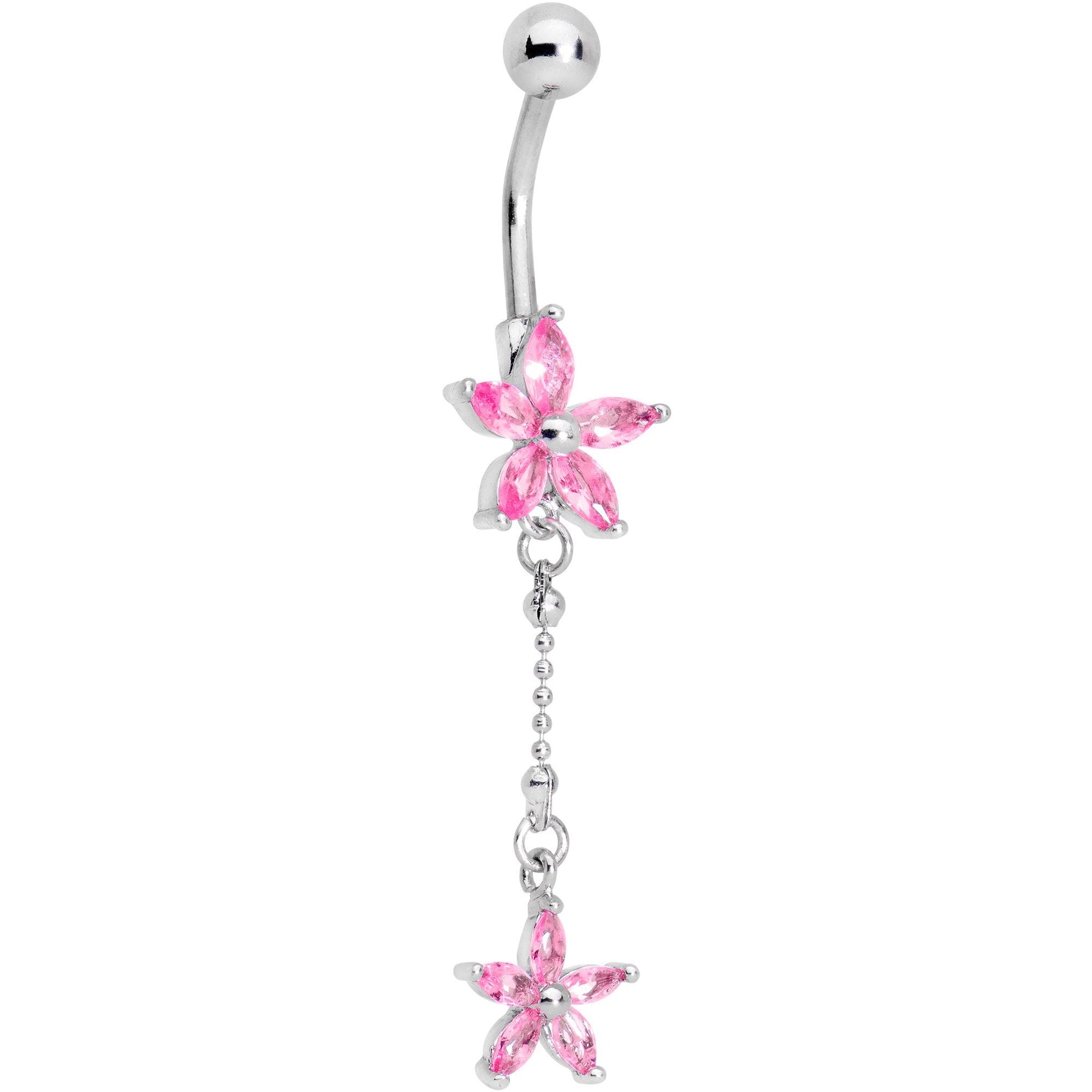 This awesome belly button jewelry features not one star, but two! Two beautiful pink, star-shaped, cubic zirconia gems dangle from this fun 14 gauge belly ring. One star charm is mounted on a 7/16" curved barbell made with durable 316L surgical grade stainless steel while the other dangles from a ball link chain.