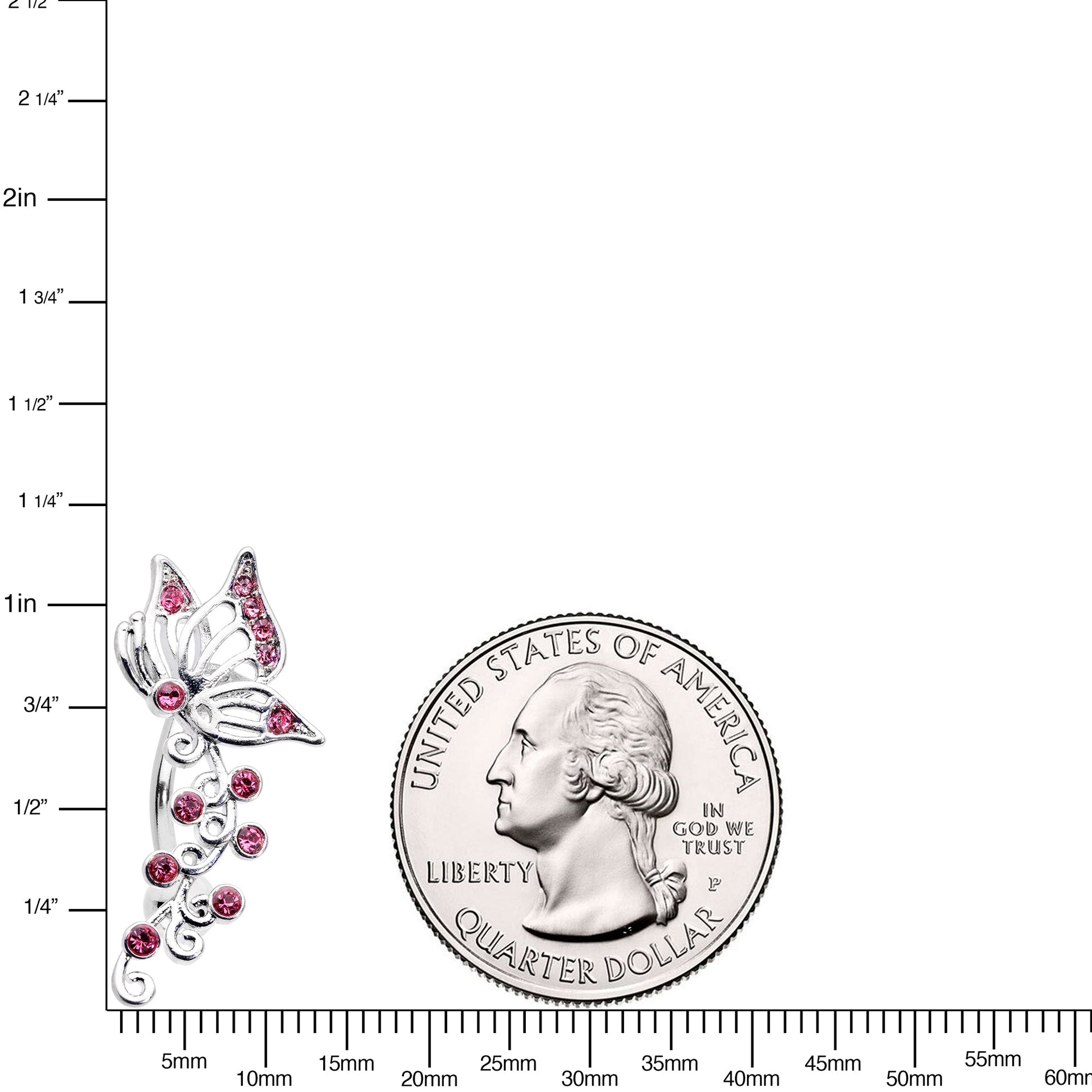 Give everyone butterflies when they see your gorgeous 14 gauge navel ring! It's made with a 3/8" durable 316L surgical grade stainless steel curved barbell with a 5mm bottom ball end. The top end features a butterfly charm with lacy, openwork wings. The butterfly is further embellished with pink gems for added glamour. The butterfly appears to be perched upon a garland of small flowers, with curling leaf details set with matching pink gems. This beautiful belly button jewelry is sure to give you butterflies!Specifications