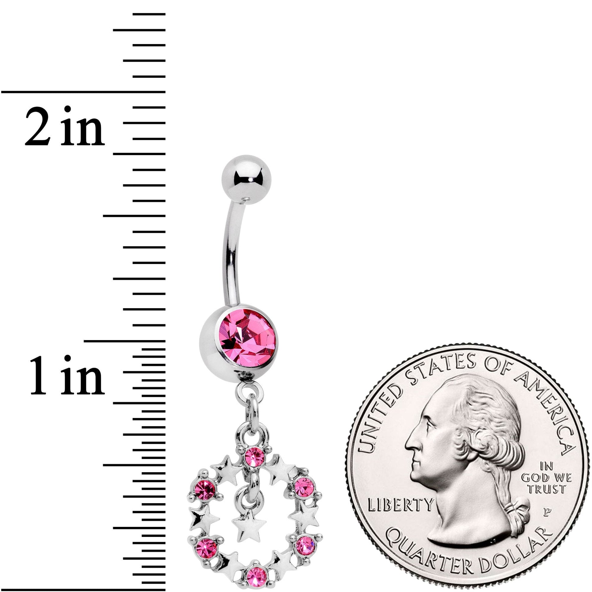 This is one constellation that you don't have to wait for the night to admire its glory. This 14 gauge navel ring supports a ring of alternating tiny stars and small pink gems, with one more star dangling down into the center of the circle for that perfect finishing touch. There is another pink gem set into the base of our 7/16" belly button ring made with a durable 316L surgical grade stainless steel curved barbell. Looking at the stars is always nice but wearing the stars is even better!Specifications