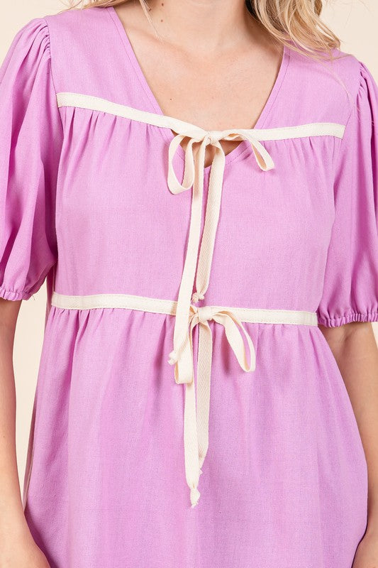 regular size, standard, young contemporary, contemporary, piping, babydoll, top, blouse, v-neck, self-tie in the front, short sleeve, balloon sleeve, loose-fit, trendy, cute, stylish, fashionable, daily wear, everyday wear, spring, summer, ss, women's clothing, women's apparel, women's wear