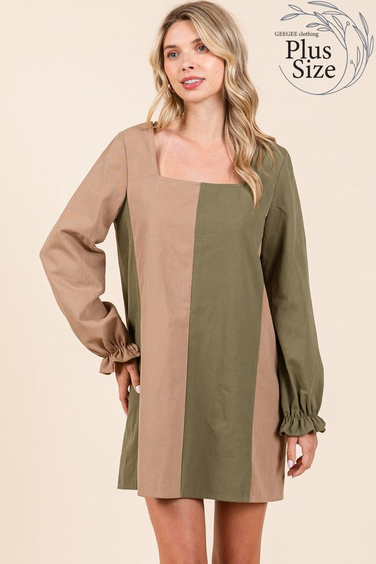 plus size, curvy, color block, mini dress, short dress, causal dress, square neck, low back, self-tie in the back, back detail, long sleeve, elastic cuff, ruffle trim, trendy, stylish, fashionable, comfortable, daily wear, outfit of the day, ootd, minimalist, transitional, fall, winter, spring, summer, fw, ss, women's clothing, women's apparel, women's wear