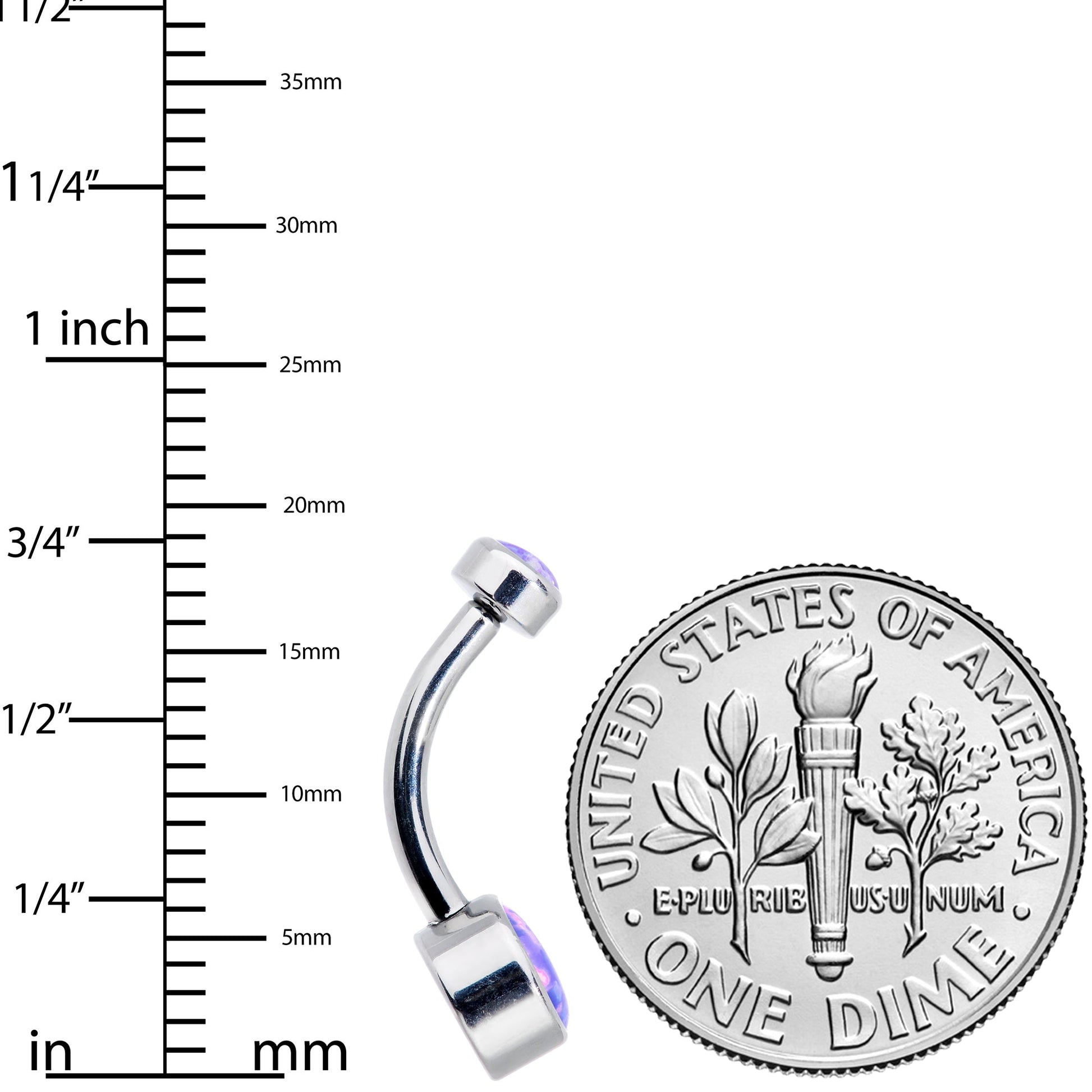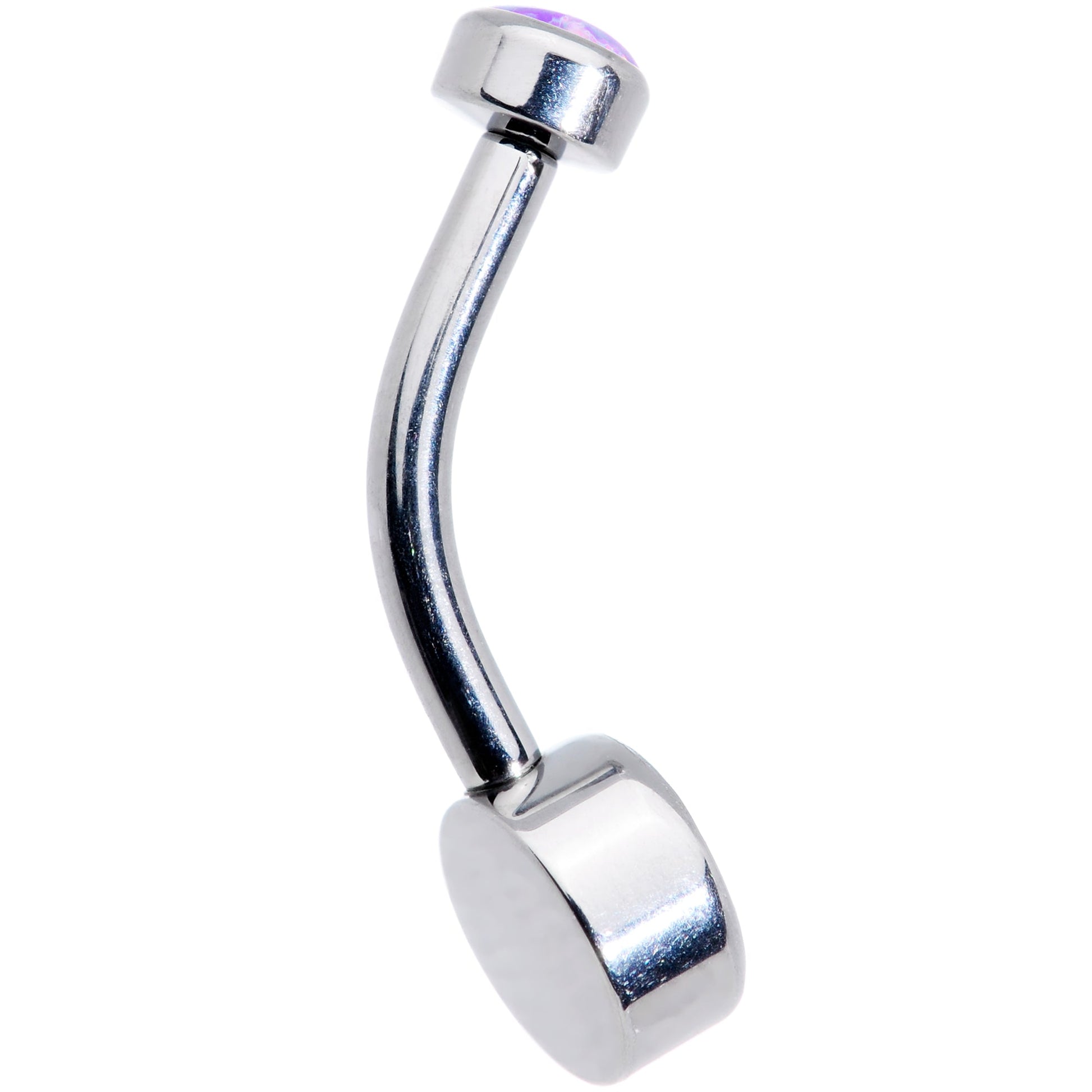 You are going to look super hot in this 14 gauge navel ring! It's made with a 3/8" solid grade 23 implant grade titanium curved barbell. The 4mm top end features a bezel set purple synthetic opal while the bottom end features a 6mm matching bezel set purple synthetic opal. This navel jewelry is also internally threaded for super comfortable insertion and removal. Show off your belly button piercing while showing that you're on top of your style game with this gorgeous and trendy belly jewelry!Specifications