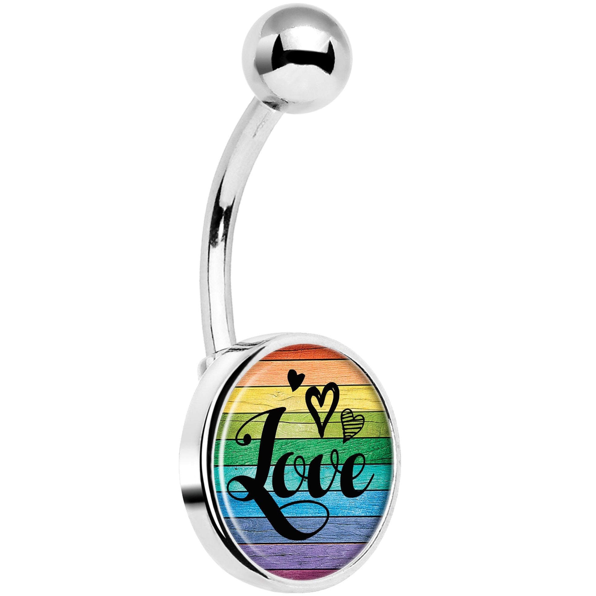 If you believe in Love and Pride for all then this navel jewelry is right for you! Made with a 7/16" durable 316L surgical grade stainless steel curved barbell, this belly button ring features the world Love on a rainbow colored wood-inspired pride background logo inlay bottom end.