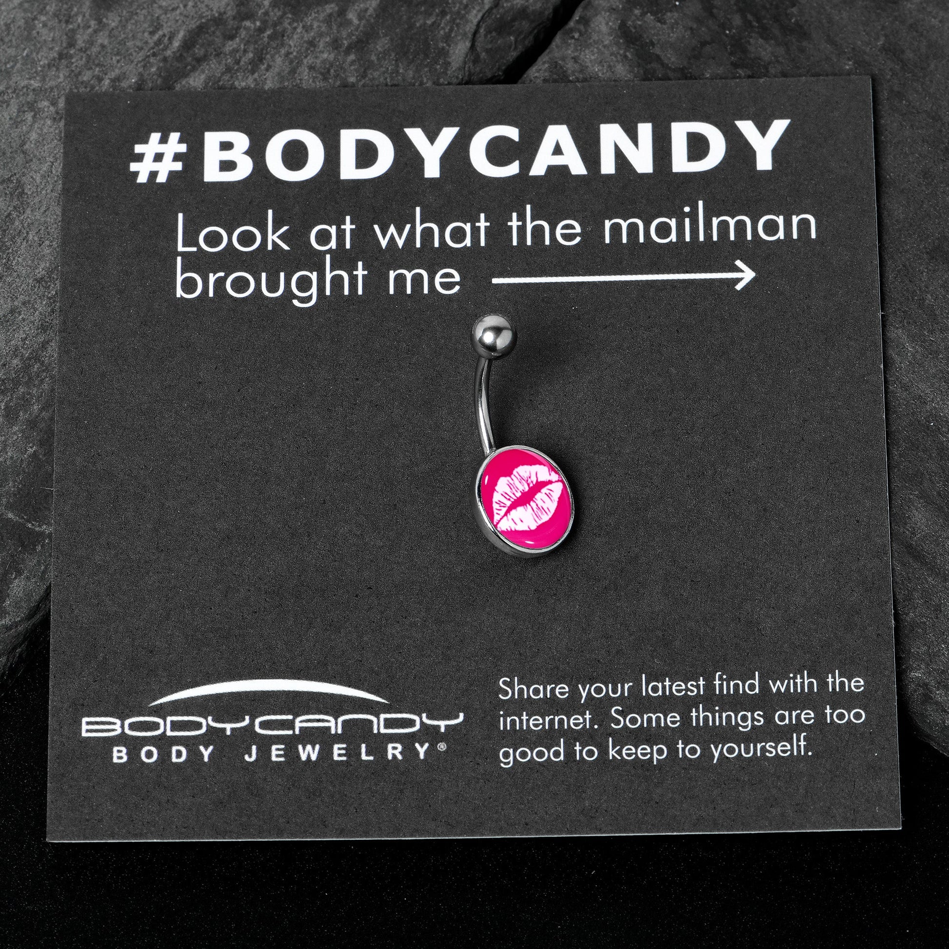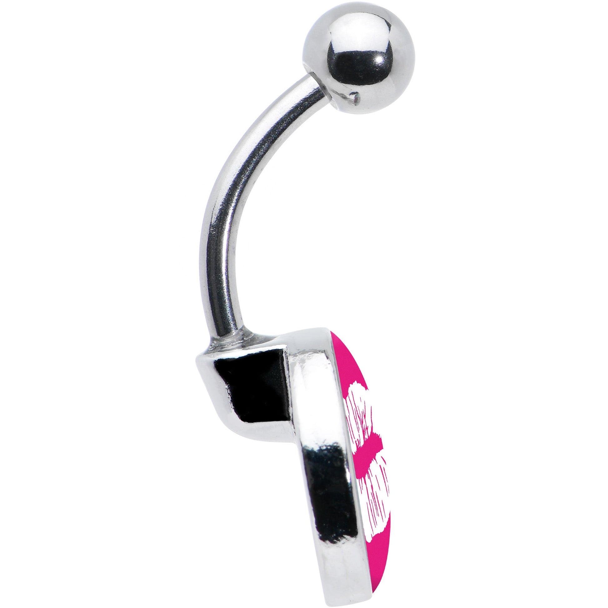 Give your look a great big kiss of style with this 14 gauge navel ring! It's made with a 7/16" durable 316L surgical grade stainless steel curved barbell with a 5mm top ball end. The bottom end features a pink disc with a white kiss mark charm. It features fine detailing on the lips for a realistic appearance. Give your piercings a whole lot of love with this romantic and colorful belly piercing ring!