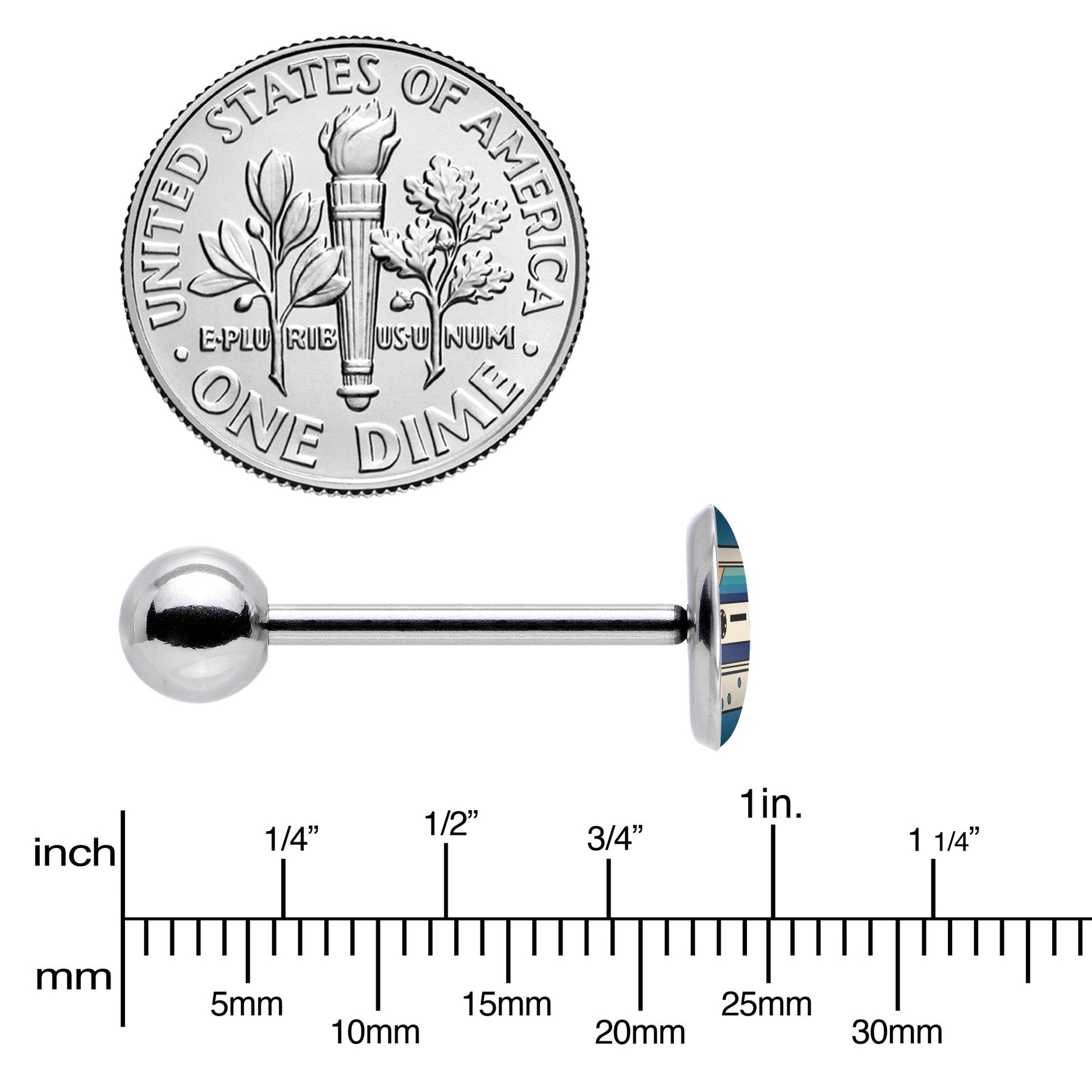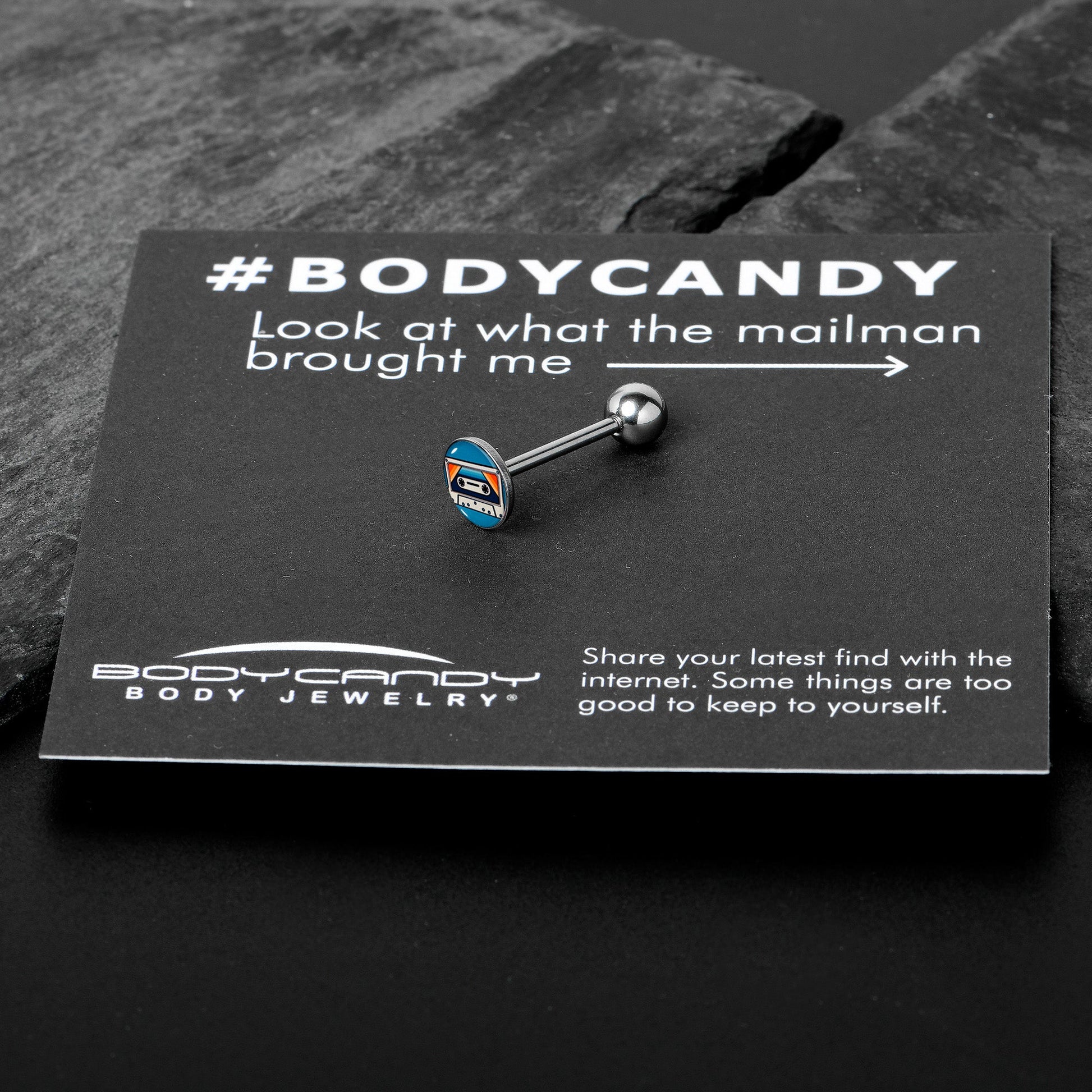 Capture the music and the moment with this retro 14 gauge tongue jewelry! It's made with a 5/8" durable 316L surgical grade stainless steel straight barbell with a 5mm bottom ball end. The disc-shaped top end is blue and features a cassette tape charm. This 80's flashback features a white body and colorful detailing in the corners for maximum impact. Grab your boombox and get ready to rock with this wonderfully retro tongue piercing ring!