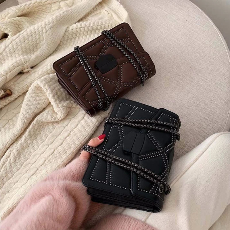 Make a bold statement with our Rivet Chain Small Crossbody Bag for Women! This trendy 2022 luxury shoulder messenger bag features edgy rivet and chain decorations, making it a stylish handbag for any fashion-forward lady.