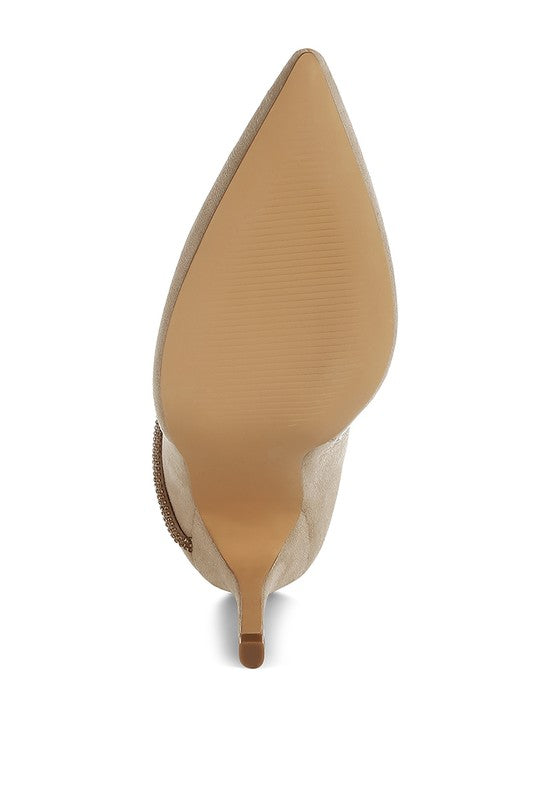 The striking ankle boots catch the eye with their sleek pointed silhouette and high stiletto heel, adorned with shimmering rhinestones. The signature rhinestone detail wrapping around the ankle makes them suave and perfect for your red-carpet-worthy occasions.