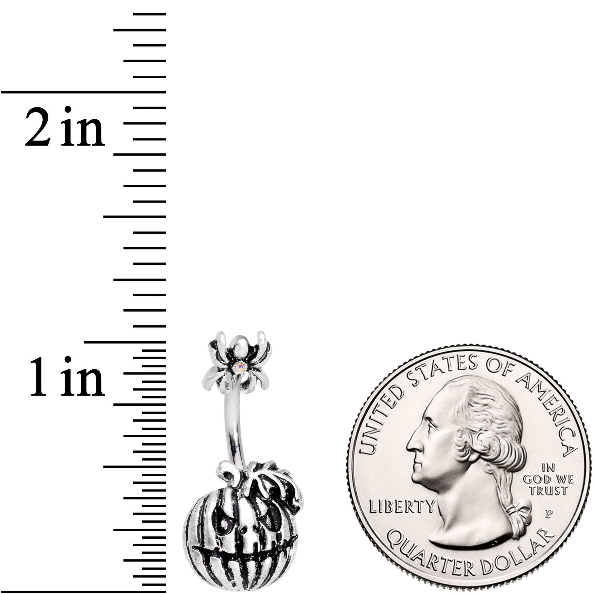If you love all the creepiest parts of Halloween then you will love this 14 gauge belly button ring. Made with a 3/8" durable 316L surgical grade stainless steel curved barbell, this navel jewelry features a top mount spider charm and creepy jack o' lantern bottom charm for scary style.Specifications