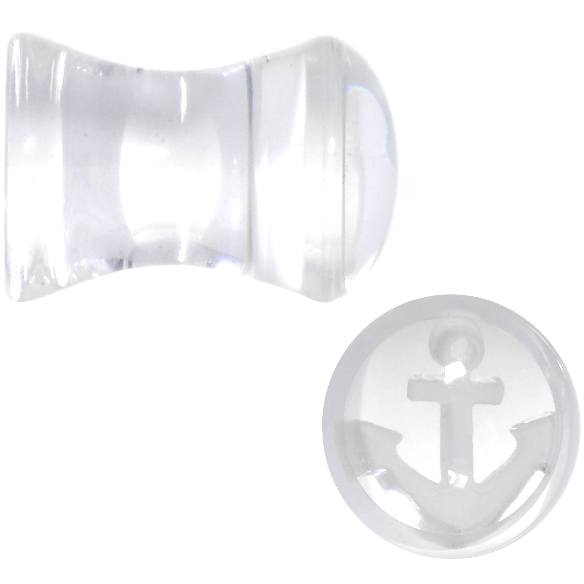 Hypoallergenic jewelry for sensitive skin.Anchor your lobes down and set sail for wherever life's journey may take you with this set of double flare acrylic plugs featuring a clear acrylic base with a white anchor depicted on the face of the plug. These saddle plugs are sold together as a set of 2 acrylic ear plugs. Available in sizes 6mm to 20mm.