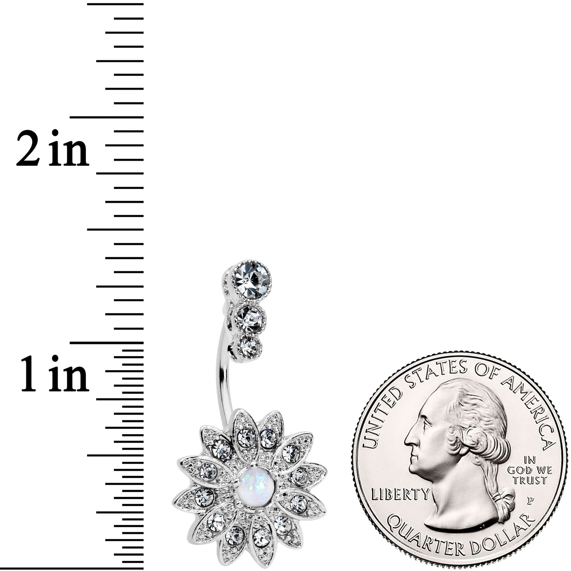 This flower is going to make your navel piercing three times as pretty with this 14 gauge navel ring! It's made with a 3/8" durable 316L surgical grade stainless steel curved barbell. The top features a trio of round clear gems, set vertically. The bottom end features a flower charm, composed of clear gems, and set with a white faux opal at the center for a luxe and cohesive appearance. Triple your style with this fashionable and floral belly button jewelry!Specifications