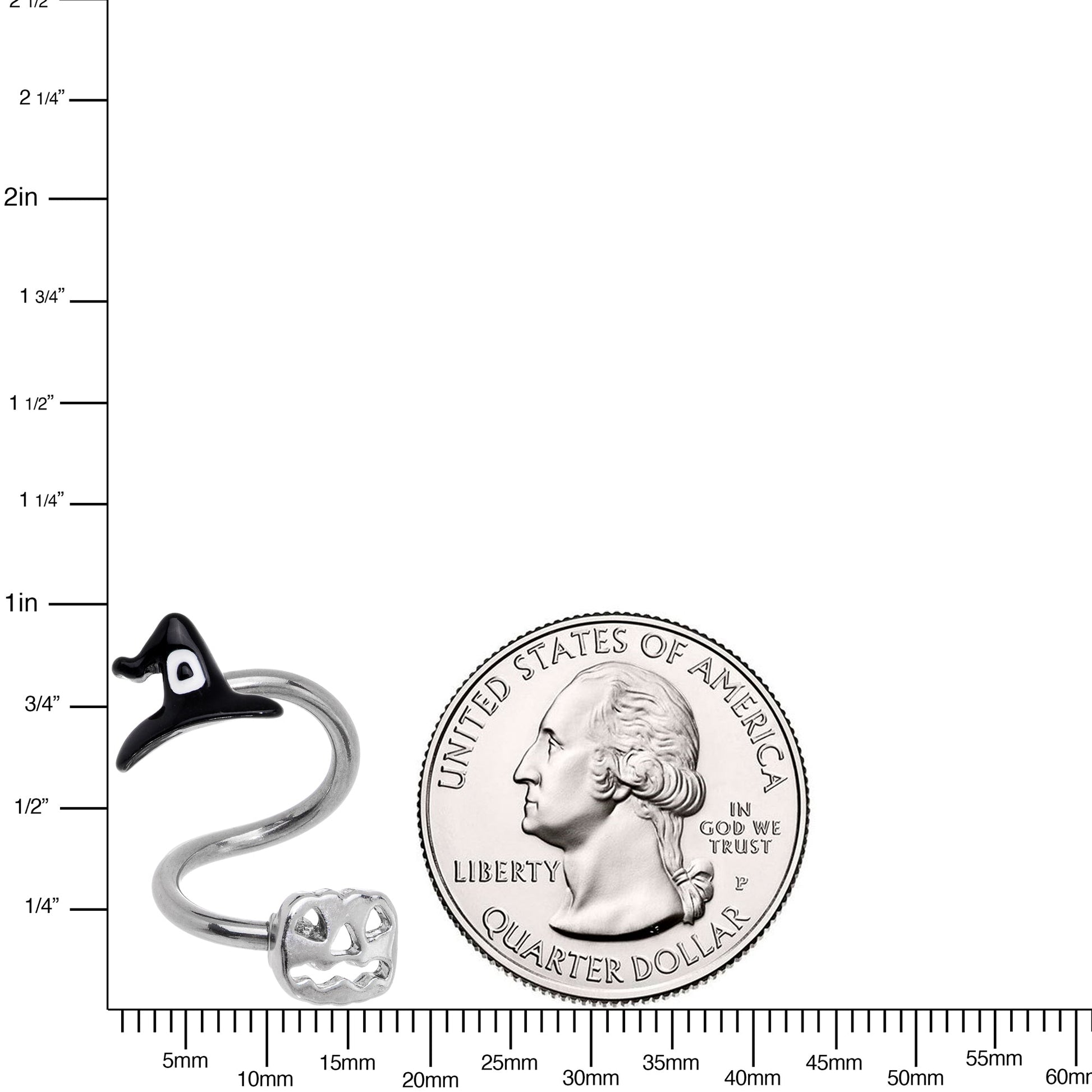 This 14 gauge spiral twister ring is sure to get your heart pumping a little bit faster, and just in time for Halloween! It's made with a 10mm durable 316L surgical grade stainless steel spiral curved barbell. One end features a witch's pointed hat charm and the other end features a pumpkin charm! Even better, this style of spiral jewelry works well in multiple piercings including navel, lip, eyebrow, and cartilage piercings like the helix and more. That's all the more reason to let this spooky skull steal your heart!!Specifications