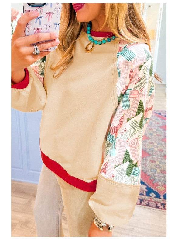 The top is adorned with a charming bowknot print raglan sleeves.
