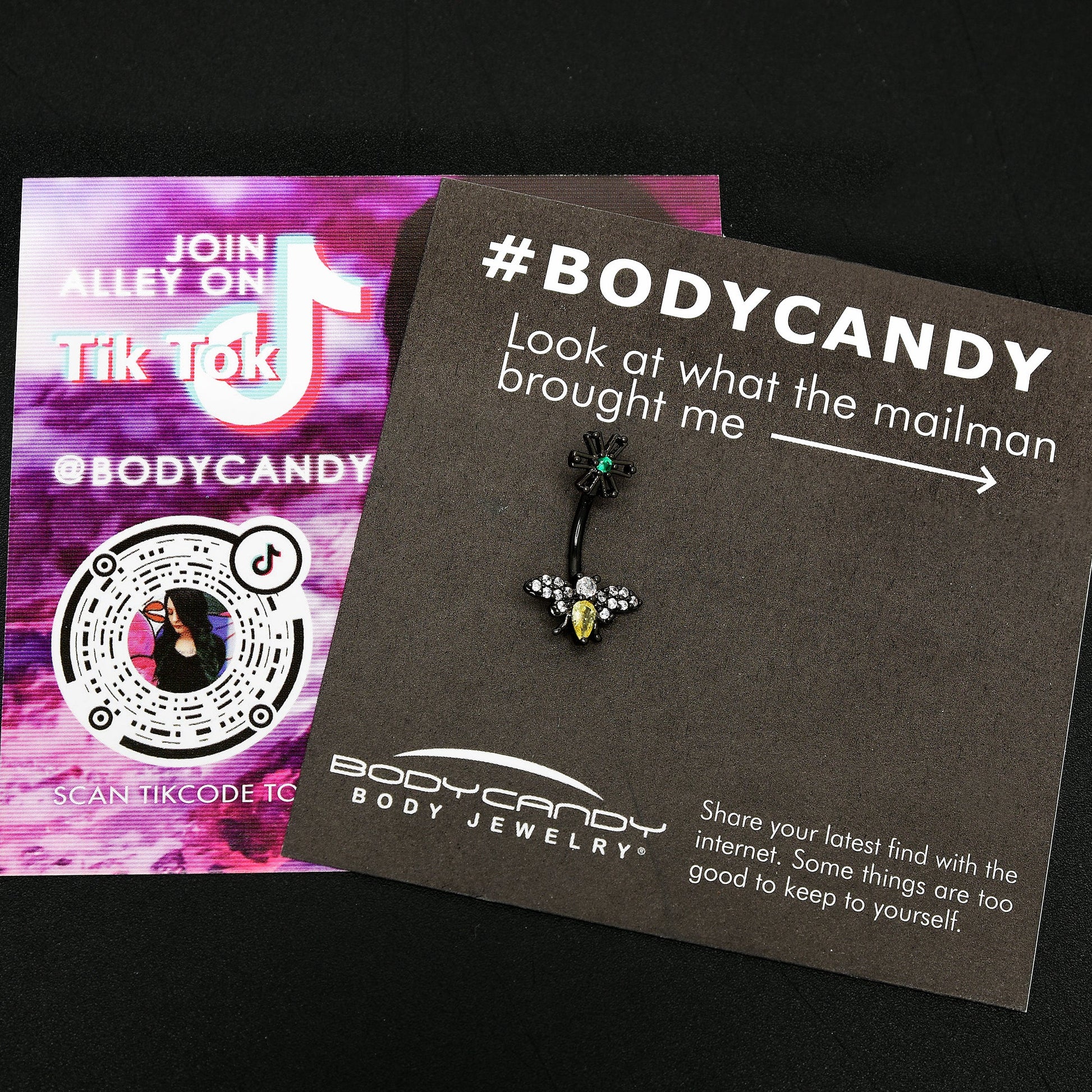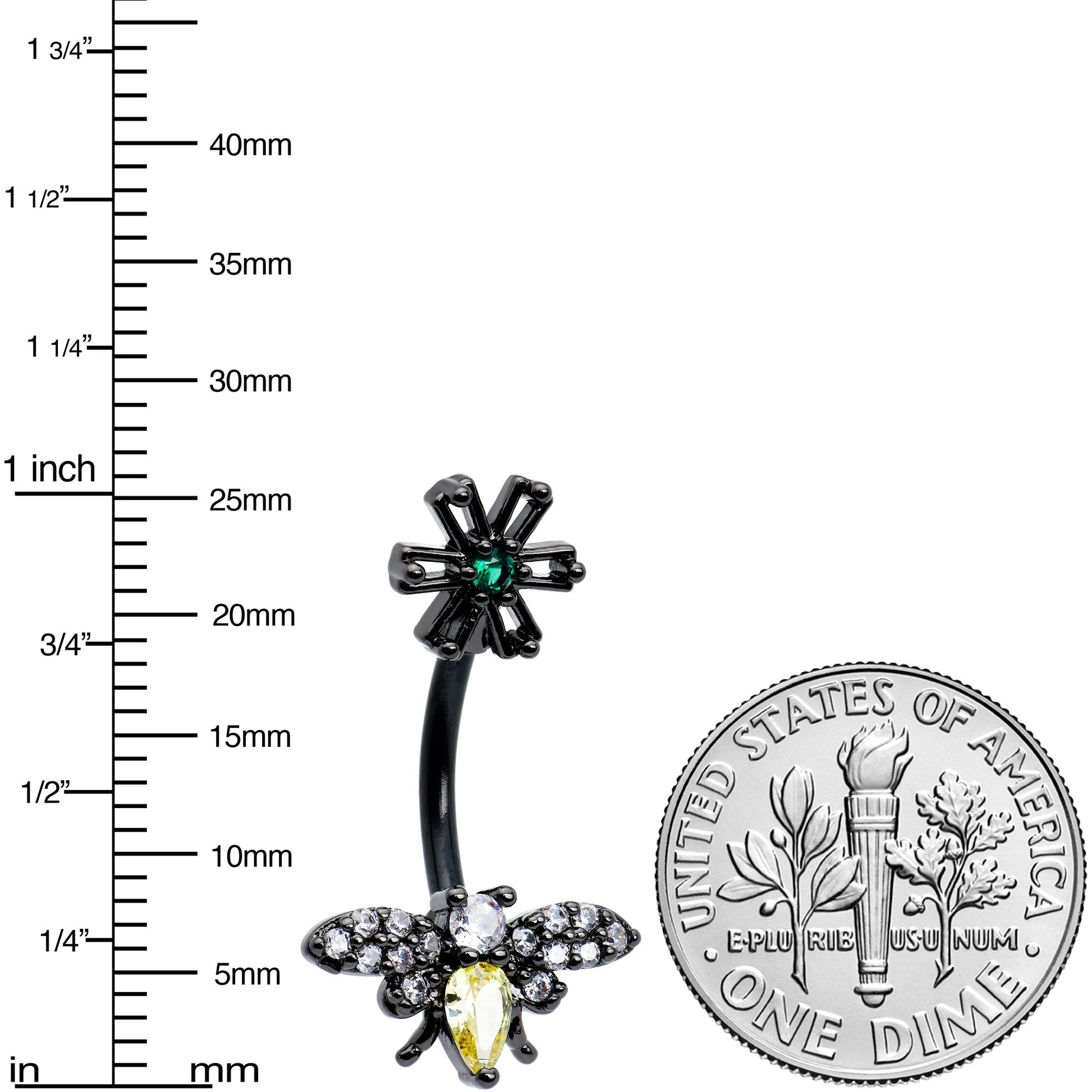 Give your heart a flutter with this 14 gauge butterfly and flower navel ring! It's made with a 3/8" black PVD over 316L surgical grade stainless steel curved barbell. The top end features a flower charm, with openwork petals and a green gem center. The bottom end features a butterfly charm. The butterfly has a yellow gem body and a clear gem head, while its wings are black and set with matching clear gems. You'll be ready to bloom with this beautiful floral butterfly belly piercing ring!Specifications