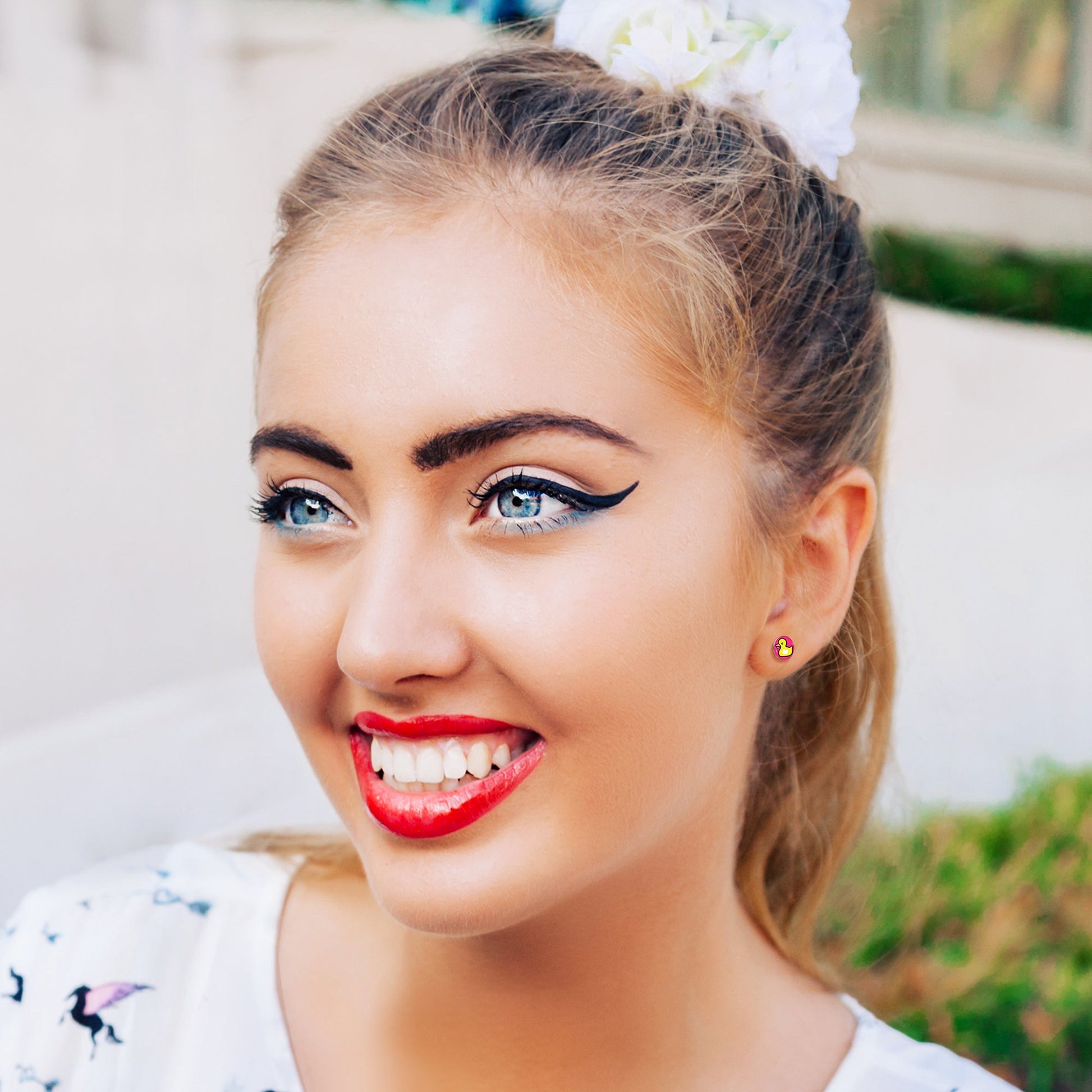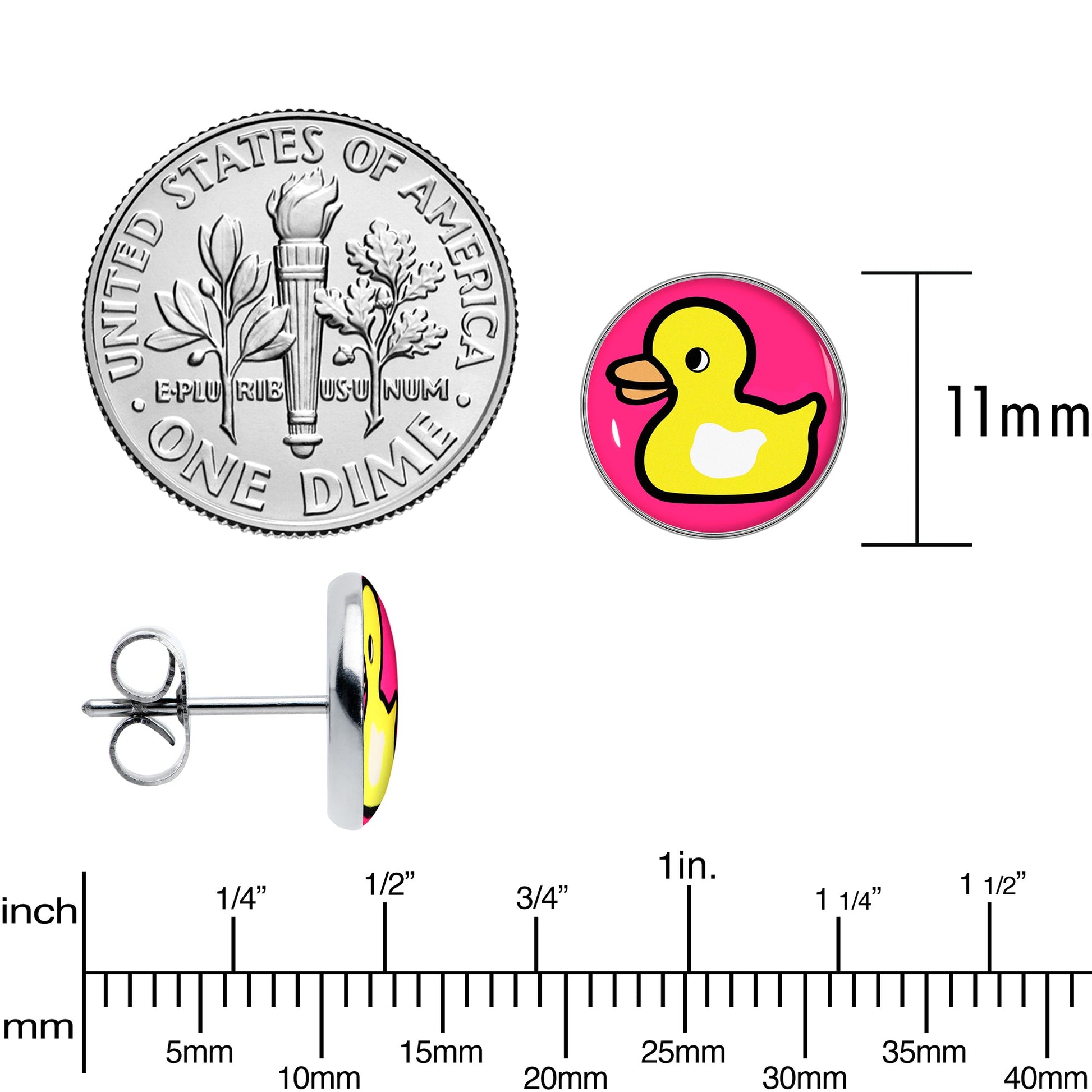 The bath duckies on these earrings for pierced ears are definitely the ones for you! They're made with stainless steel straight posts with friction backs for a secure fit. They each feature a disc shaped ducky charm, with a vibrant pink background. The ducks are a traditional yellow with white embellishment on their wings. Get down with the ducks with these darling ducky stud earrings! Sold as a set of two.